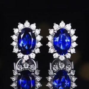 Luncy Jewelry 18k Gold 0.99ct Oval Cut Natural Royal Blue Sapphire with Diamonds Jewellery Earrings for Gift to Women