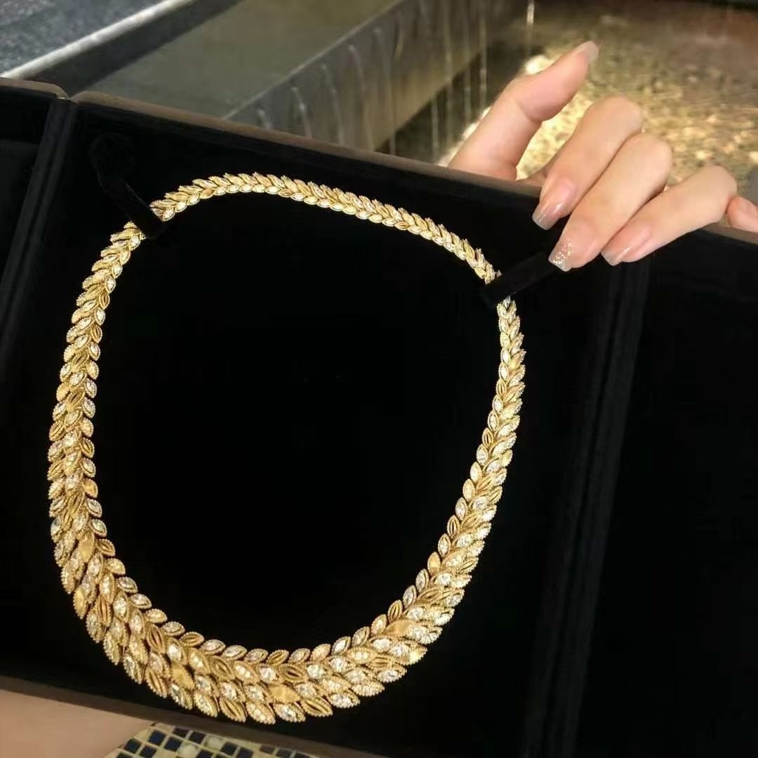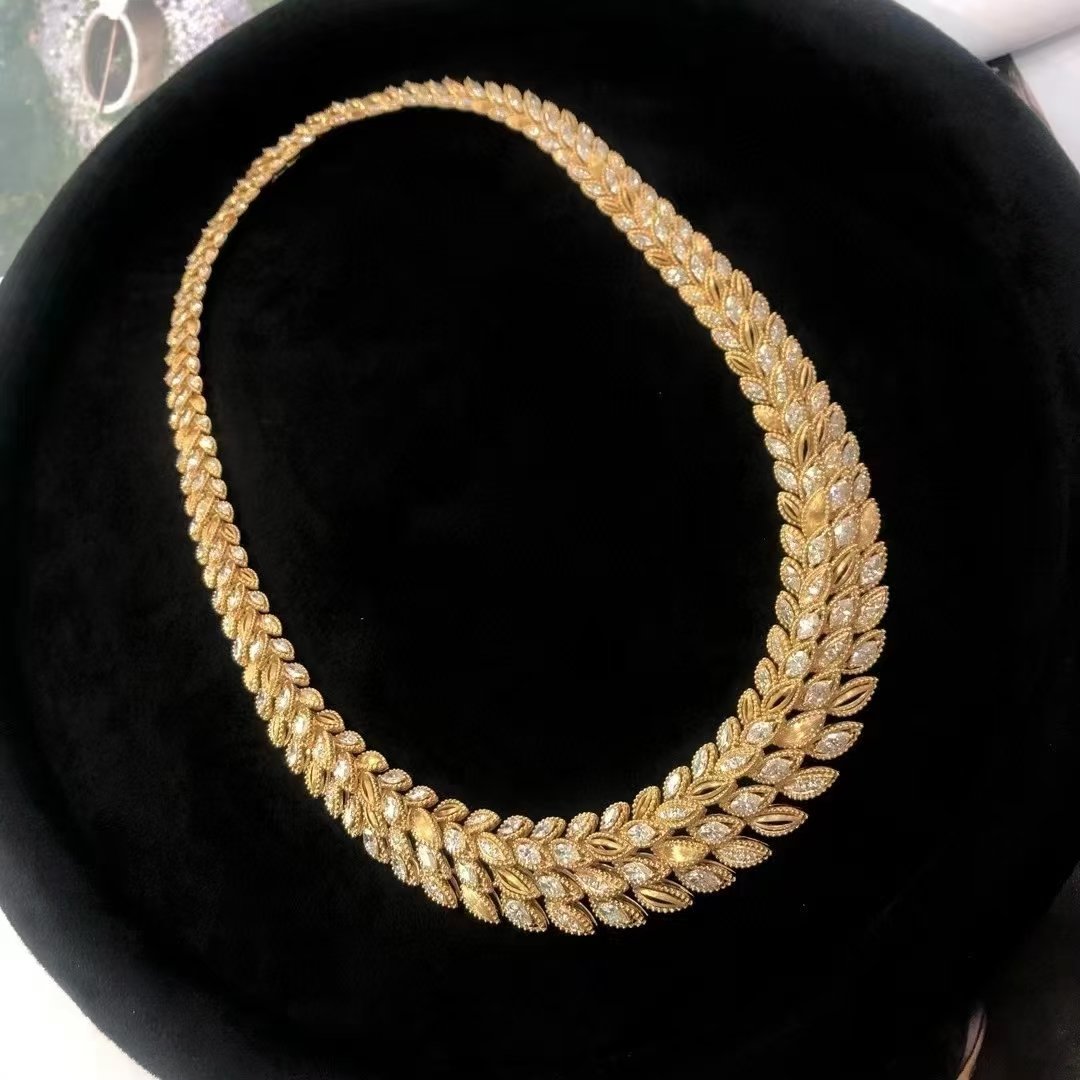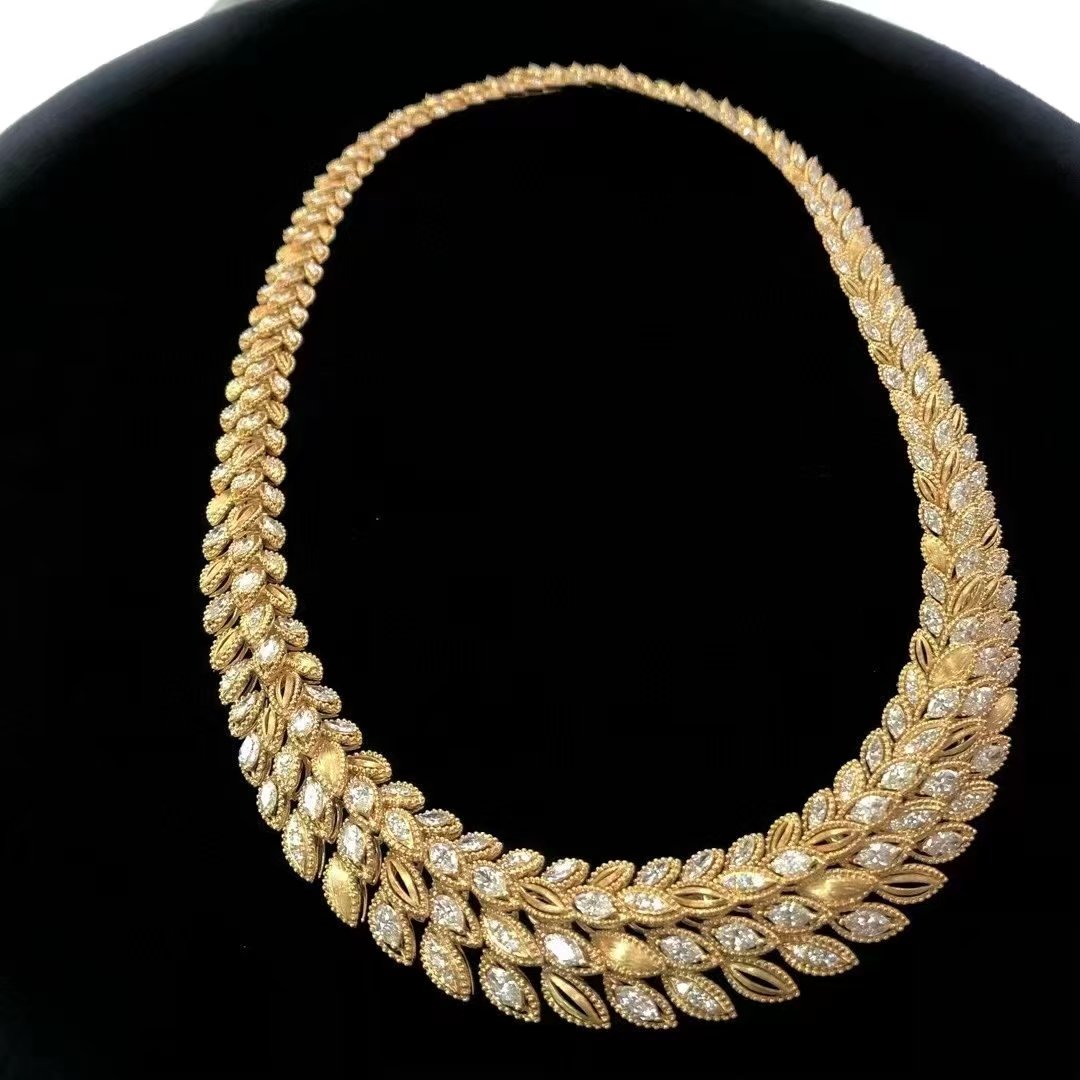 Introducing our exquisite 18k Gold Diamond Necklace, featuring a stunning D19.181ct main stone. This unique wheat ear design elegantly captures the essence of nature, enhanced by the shimmering dew drop motif. With a total weight of 128.430g, this necklace is not only a luxurious statement piece but also a testament to exceptional craftsmanship. Perfect for special occasions or as a timeless addition to any jewelry collection, it embodies elegance and sophistication. Elevate your style with this remarkable piece that beautifully combines modern design with classic charm.