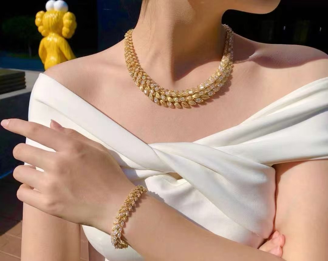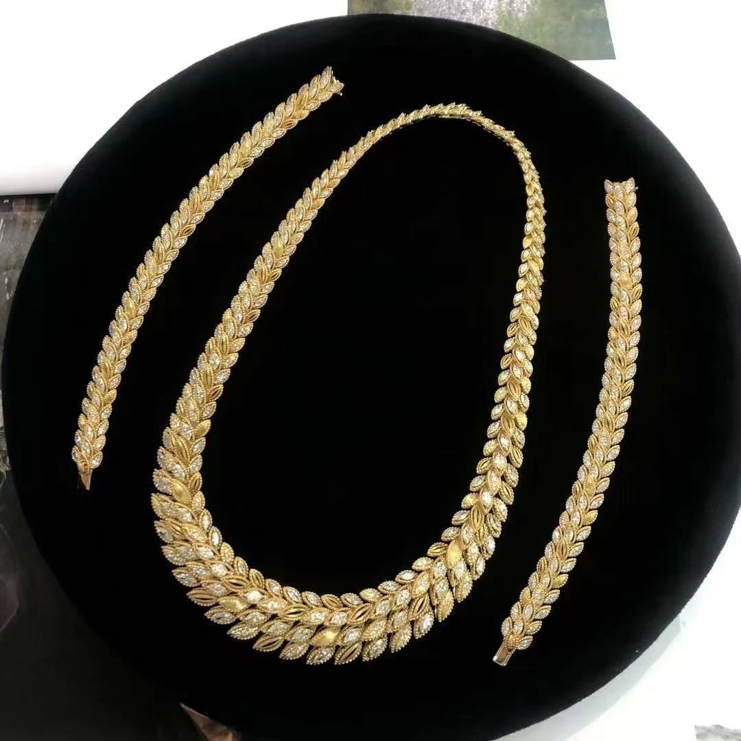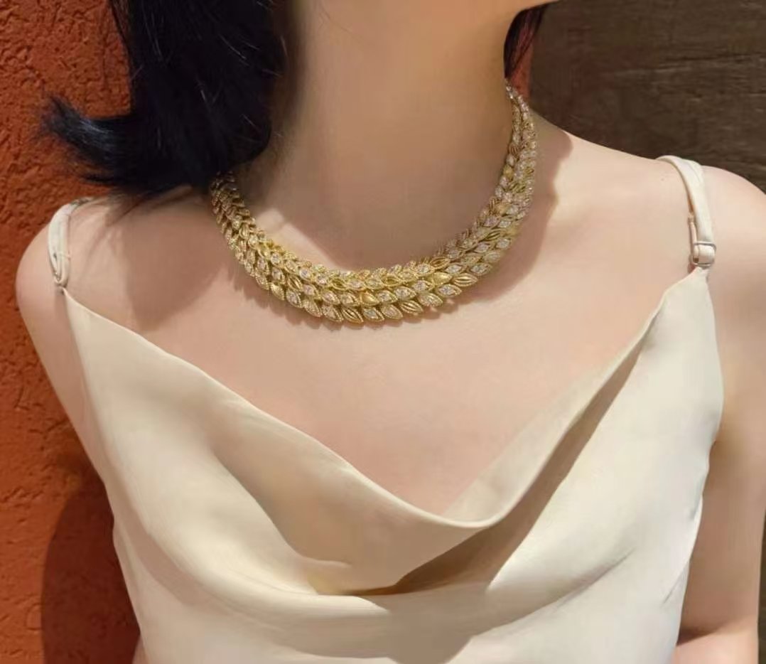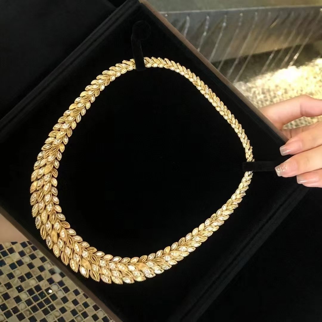 Introducing our exquisite 18k Gold Diamond Necklace, featuring a stunning D19.181ct main stone. This unique wheat ear design elegantly captures the essence of nature, enhanced by the shimmering dew drop motif. With a total weight of 128.430g, this necklace is not only a luxurious statement piece but also a testament to exceptional craftsmanship. Perfect for special occasions or as a timeless addition to any jewelry collection, it embodies elegance and sophistication. Elevate your style with this remarkable piece that beautifully combines modern design with classic charm.