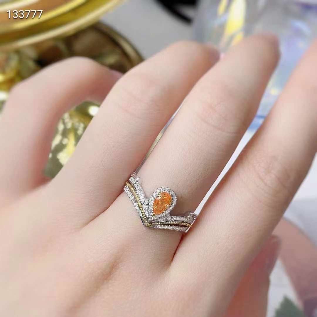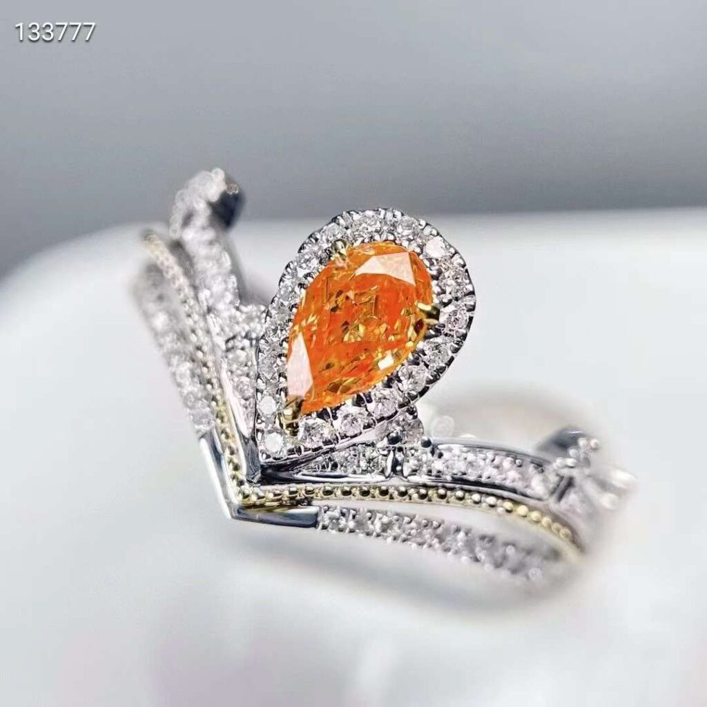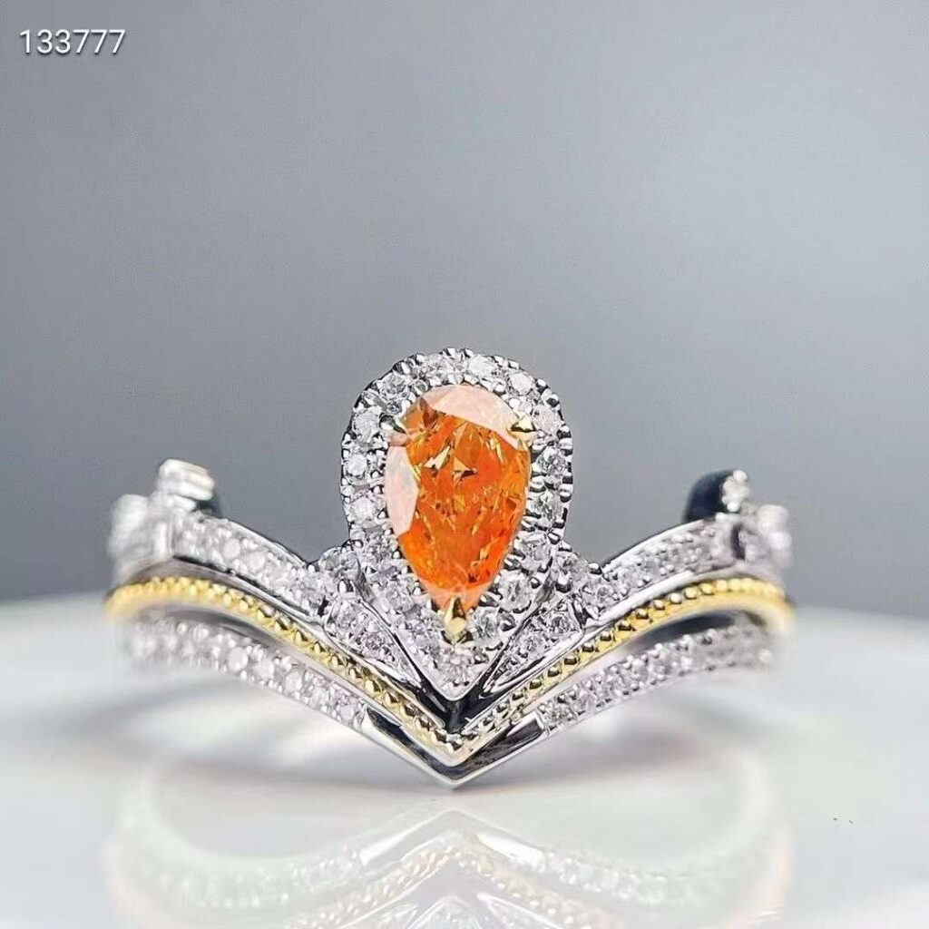 Introducing the SGARIT Fine Jewelry Factory’s exquisite custom solid 18k white gold ring, featuring a stunning 0.3-carat pear-cut vivid orange-yellow natural diamond. This luxurious piece is designed for those who appreciate elegance and uniqueness. The vibrant diamond, with its exceptional clarity, is set in high-quality white gold, creating a striking contrast that enhances its brilliance. Perfect for special occasions or as a statement piece, this ring embodies sophistication and style. Whether you’re looking to treat yourself or find the perfect gift, this ring is a timeless addition to any jewelry collection. Elevate your elegance with this extraordinary piece from SGARIT.